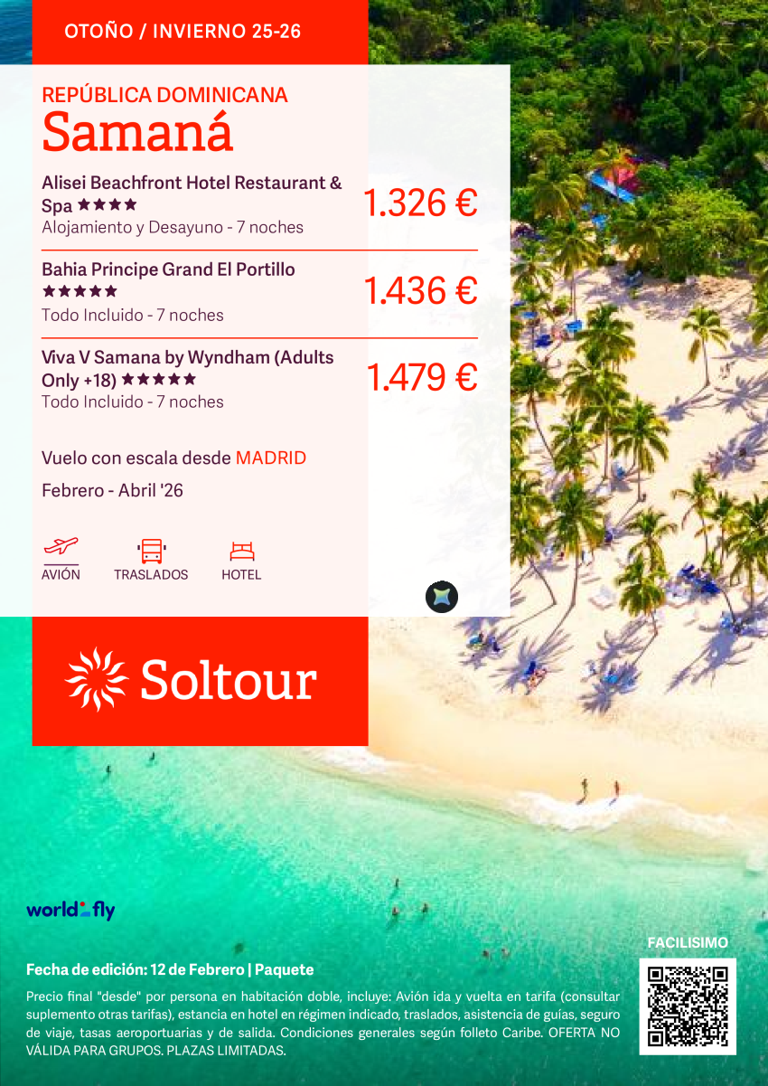 Samaná en Alisei Beachfront Hotel, Bahia Principe Grand El Portio o Viva V Samana by Wyndham desde 1.326€, salidas desde Madrid